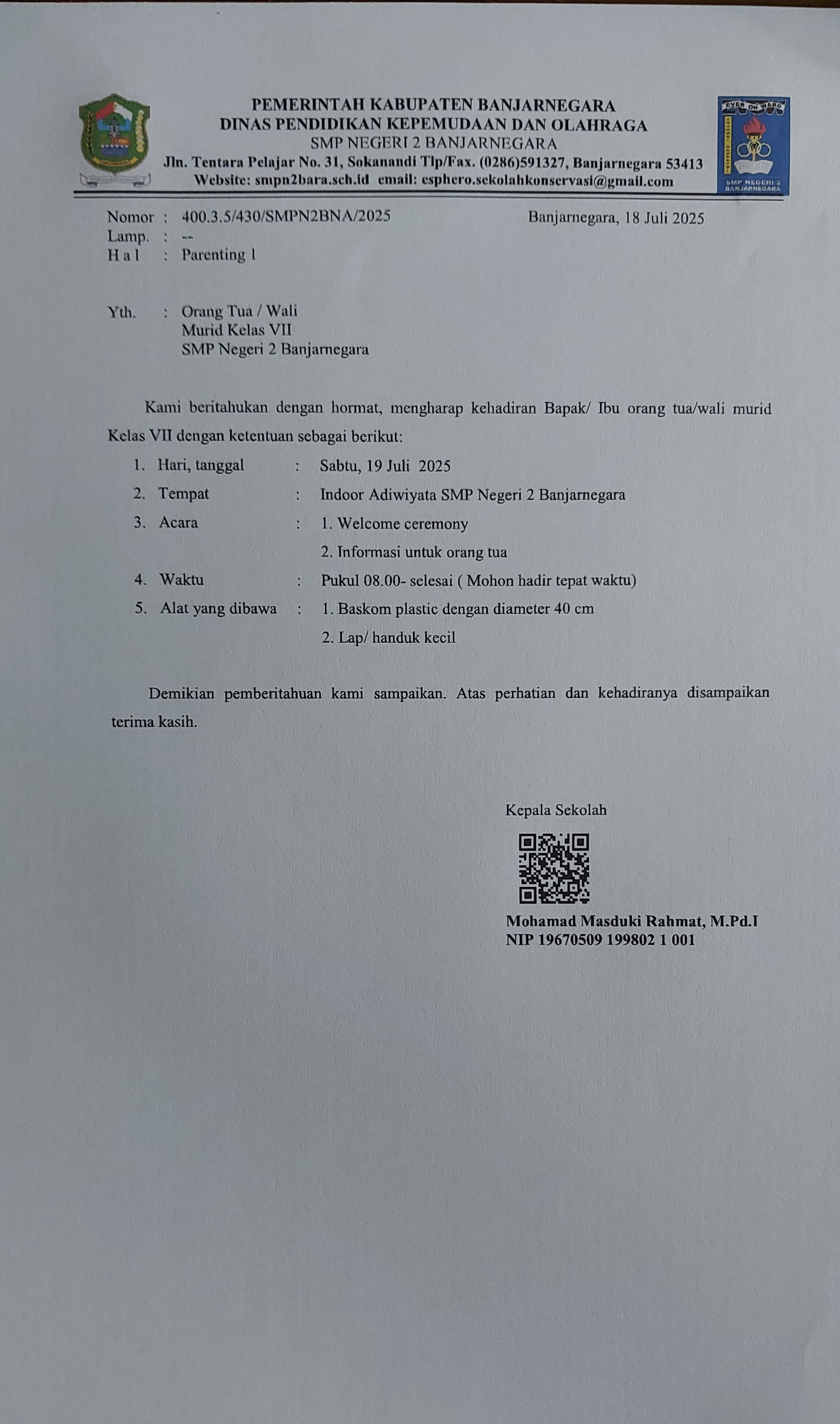 Informasi penting untuk Wali Murid Kelas VII Tahun Pelajaran 2025/2026